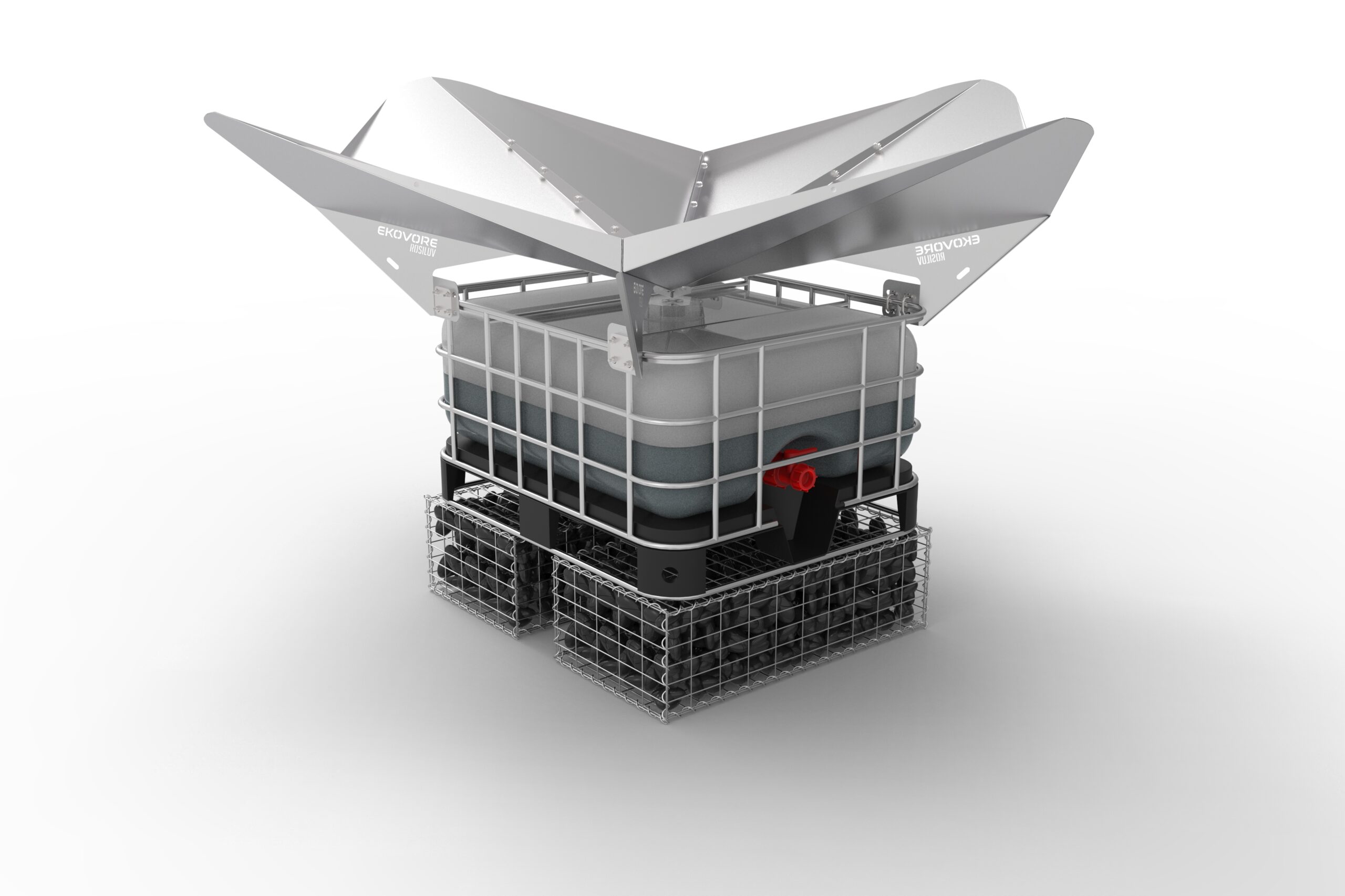 It is a funnel roof of 4.3m2 which is fixed on an IBC 1000×1200 type water tanker.